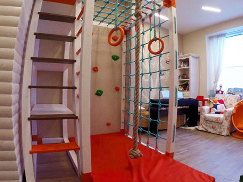 Детские площадки для квартиры могут быть похожи на лаконичный гимнастический зал или вольер для мартышек… Если надо, то потолок будет небом, а паркет газоном. Воображайте дорогие взрослые, оглядывая пока еще пустую комнату, предназначенную для детской. Полистайте журналы, загляните в интернет, посетите зоопарк… Потом звоните нам. Уж мы то развернемся на славу.